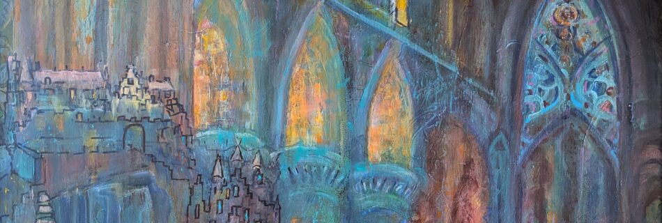 Built into the medieval walls of Stirling Old Town, sits Cowane’s Hospital, another former studio space. A fifteenth century alms house built for a dozen ‘decayed brethren’. Amongst the ghosts of the decayed, I took my space and conjured up paintings of the Battles of Flodden 1513, Bannockburn 1314 and the bravery of Marie de Guise, the mother of Mary, Queen of Scots. Blinking in the sunlight of the 21st century, I had stepped across the way into the Church of the Holy Rude where once again, I now draw and paint free hand, the soaring pillars and arches and feel that deep, welcoming familiarity of its architectural bones.